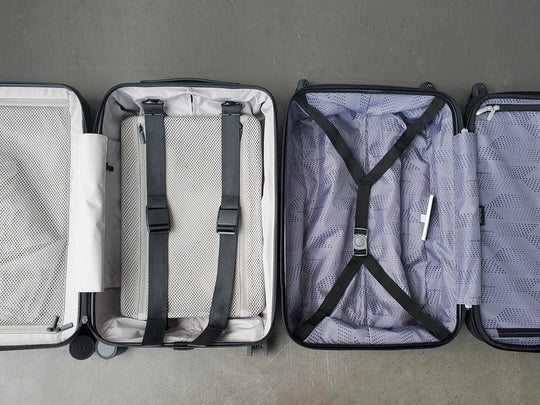 Monos attaches its industrial-grade straps to the wheels and handle with screws for a secure fit. In contrast, Samsonite's standard elastic straps are attached to the shell, offering a less stable fit.